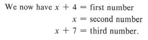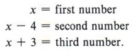 | Again, we could just as well let x represent the second or third number. The important thing to remember is to label each algebraic expression with the number that it represents. |