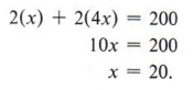 Check: The width (20) is one fourth the length (80). Also, the perimeter is 2(20) + 2(80) = 40 + 160 = 200.