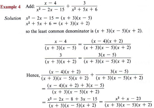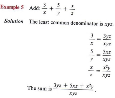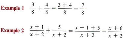 We are now prepared to add algebraic fractions by using the techniques discussed in the preceding two sections. You should recall the following rule from arithmetic.