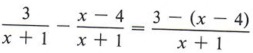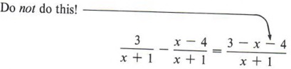 | Notice we placed parentheses around the numerator of the second fraction. Notice we first multiplied (x - 4) (2x - 1) and then multiplied (2x2 - 9x + 4) by -l.To multiply and change signs at the same time is to invite error. |