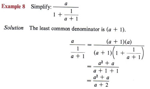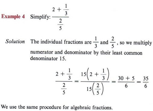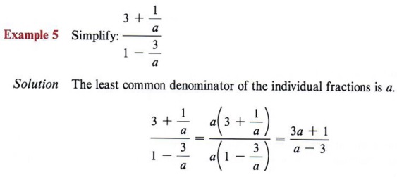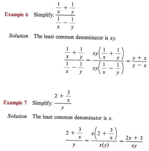 Fractions are defined as the indicated quotient of two expressions. In this section we will present a method for simplifying fractions in which the numerator or denominator or both are themselves composed of fractions. Such fractions are called complex fractions.