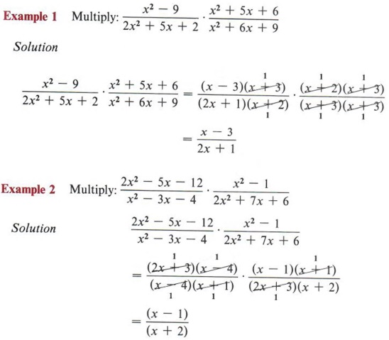When multiplying algebraic fractions, factor all numerators and denominators completely, then divide by all factors common to a numerator and denominator before multiplying.