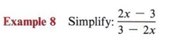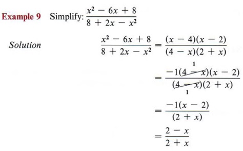 Solution This type of problem requires special attention because it is a common cause for error. At first glance the factors might be mistakenly considered as common, or the fraction might be mistakenly considered as already simplified. Note that the factors cannot be divided since the signs keep them from being identical. If, however, negative 1 is factored from one of the factors, then there are like factors and division can be accomplished.