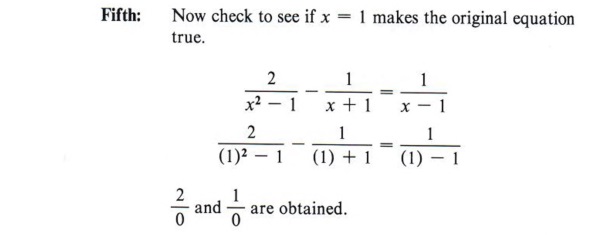 | Checking is necessary in algebraic equations. Otherwise you could do a lot of work-make no mistake-and still miss the problems. In other words, x = 1 is not a solution since it gives a statement with no meaning. |