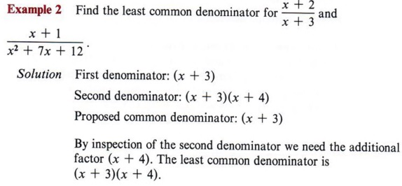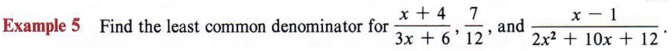By inspection of the second denominator we see we need to include the factors (2) and (2). We now have 2(2)(3)(x + 2). By inspection of the third denominator we see we need the factor (x + 3). The least common denominator is 2(2)(3)(x + 2)(x + 3) or 12(x + 2)(x + 3).
