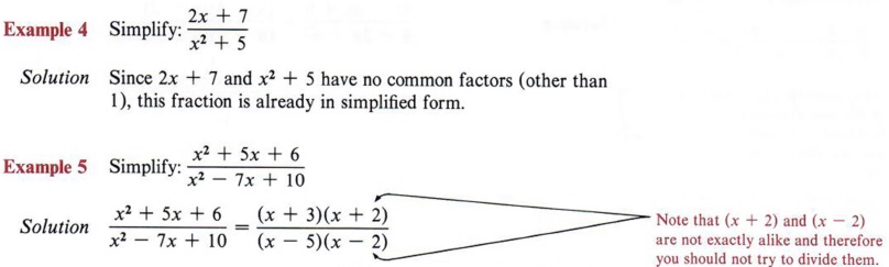 Notice that even though we were able to factor the numerator and denominator, we still cannot divide since no factors are common to both. The given fraction is already in simplified form.