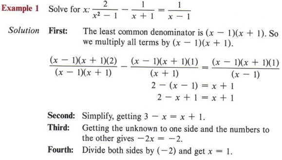 - To solve equations having fractions first eliminate all fractions by multiplying the entire equation by the LCD of the fractions involved. The resulting equation is then solved, and the solution must be checked in the original equation.
