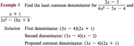 By inspection of the second denominator we need the additional factor (x - 2). The least common denominator is (3x - 4)(2x + l)(x - 2).