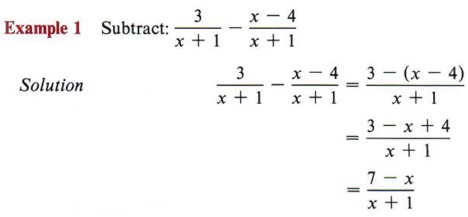 | Notice we are subtracting the entire numerator of the second fraction. It will therefore be a good practice to place the entire numerator in parentheses with the subtraction sign in front of it. |