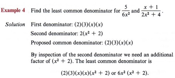 , it is easy to arrive at a least common denominator of 12. If asked how we arrived at 12, we just know that 12 is the least number divisible by both 4 and 6. However, a more involved method is necessary if the numbers are larger or if the fractions are algebraic fractions.