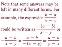| All of these are equivalent forms of the same expression. The preferred form would be one that uses the least number of written signs. Always check your answer to see if it is equivalent to the form given in the answer section. |