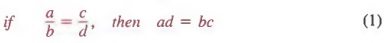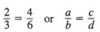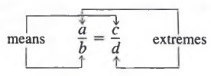 is called a proportion and read "2 is to 3 as 4 is to 6" and "a is to b as c is to d." The numbers a, b, c, and d are called the first, second, third, and fourth terms of the proportion, respectively. The first and fourth terms are called the extremes of the proportion, and the second and third terms are called the means of the proportion.