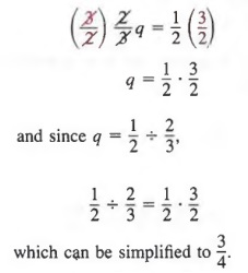 In dividing one fraction by another, we look for a number that, when multiplied by the divisor, yields the dividend. This is precisely the same notion as that of dividing one integer by another; a ÷ b is a number q, the quotient, such that bq = a.