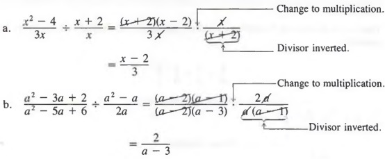 When the fractions in a quotient involve algebraic expressions, it is necessary to factor wherever possible and divide out common factors before multiplying.