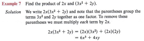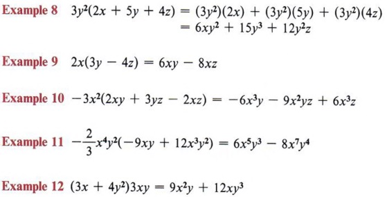 In the process of removing parentheses we have already noted that all terms in the parentheses are affected by the sign or number preceding the parentheses. We now extend this idea to multiply a monomial by a polynomial.