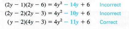 By using FOIL, we see that ac = 4 and bd = 6. The positive factors of 4 are 4 and 1 or 2 and 2. Since the middle term is negative, we consider only negative factors of 6. The possibilities are - 2 and - 3 or - 1 and - 6. Now we try various arrangements of these factors until we find one that gives the correct coefficient of y.