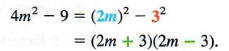 First, recognize that 4m^2 - 9 is the difference of two squares, since 4m^2 =(2m)^2 and 9 = 3^2. Use the pattern for the difference of two squares with 2m replacing x and 3 replacing y. Doing this gives: