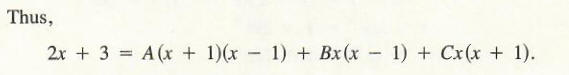 We are still not done - A and B need to be solved for. However now we are down to two equations, because we already know C and D. Choosing some other 'simple' values for x, such as 2 and -1 will give us two equations in A and B that are trivial: