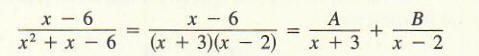For the fraction (x - 6)/(x^2 + x - 6), we now find a partial fraction decomposition as follows.