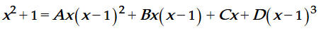The standard way to solve this is making a system of 4 linear equations in A,B,C and D. However this approach gets messy quickly. There is another way to do this - substitute some values for x that will make the equation significantly simpler. The good candidates for x values are 1 and 2. Because most of the equation disappears, this immediately gives us C =2 and D = -1.
