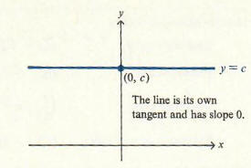 It is easy to see this geometrically. Referring to Figure 1, we see that the graph of the constant function f(x) = c is a horizontal line. Since a horizontal line has slope 0, and the line is its own tangent, it follows that the slope of the tangent line is zero everywhere.