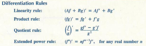 The four rules listed above, together with the rule on differentiating constant functions and the power rule, provide us with techniques for differentiating any function that is expressible as a power or root of a quotient of polynomial functions. The next series of examples illustrates this. The linearity rule and the product rule will be justified at the end of the section; a proof of the extended power rule appears in the section on the chain rule.
