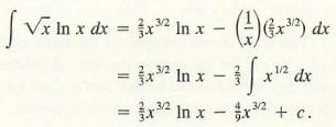 We could let g '(x) = ln(x) and use the result of Example 2, but then g (x) would be fairly complicated. Instead we let f(x) = ln(x) and g'(x) = x1/2, in which case f '(x) = l/x and g(x) = 2/3x3/2.Hence,