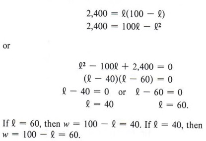 Example 4 A farm manager has 200 meters of fence on hand and wishes to enclose a rectangular field so that it will contain 2,400 square meters in area. What should the dimensions of the field be?