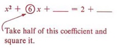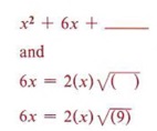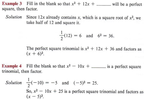 Consider this problem: Fill in the blank so that "x2 + 6x + _______" will be a perfect square trinomial. From the two conditions for a perfect square trinomial we know that the blank must contain a perfect square and that 6x must be twice the product of the square root of x2 and the number in the blank. Since x is already present in 6x and is a square root of x2, then 6 must be twice the square root of the number we place in the blank. In other words, if we first take half of 6 and then square that result, we will obtain the necessary number for the blank.