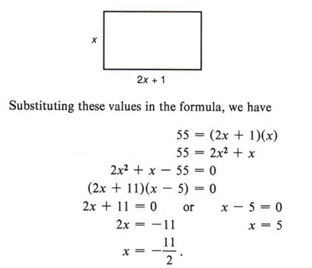 Solution The formula for the area of a rectangle is Area = Length X Width. Let x = width, 2x + 1 = length.