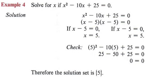 | Notice here the two solutions are equal. This only occurs when the trinomial is a perfect square. |
