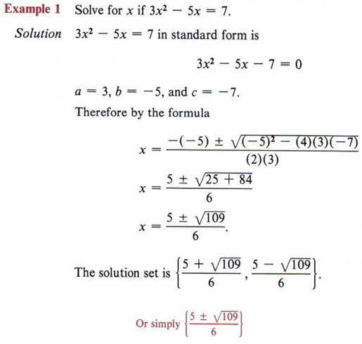 - To use the quadratic formula write the equation in standard form, identify a, b, and c, and substitute these values into the formula. All solutions should be simplified.