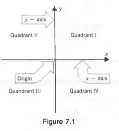 In Section 1.1, we saw that every number corresponds to a point in a line. Simi- larly, every ordered pair of numbers (x, y) corresponds to a point in a plane. To graph an ordered pair of numbers, we begin by constructing a pair of perpendicular number lines, called axes. The horizontal axis is called the x-axis, the vertical axis is called the y-axis, and their point of intersection is called the origin. These axes divide the plane into four quadrants, as shown in Figure 7.1.
