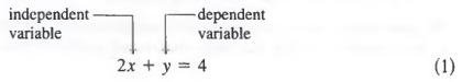 In any particular equation involving two variables, when we assign a value to one of the variables, the value for the other variable is determined and therefore dependent on the first. It is convenient to speak of the variable associated with the first component of an ordered pair as the independent variable and the variable associated with the second component of an ordered pair as the dependent variable. If the variables x and y are used in an equation, it is understood that replace- ments for x are first components and hence x is the independent variable and replacements for y are second components and hence y is the dependent variable. For example, we can obtain pairings for equation