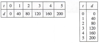 (0,0), (1,40), (2,80), (3,120), (4,160), and (5,200)