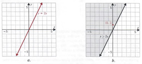 We begin by graphing the line y = 2x (see graph a). Since the line passes through the origin, we must choose another point not on the line as our test point. We will use (0, 1). Since the statement