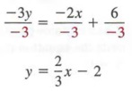 Comparing this equation with the form y = mx + b, we note that the slope m (the coefficient of x) equals 2/3, and the y-intercept equals -2.