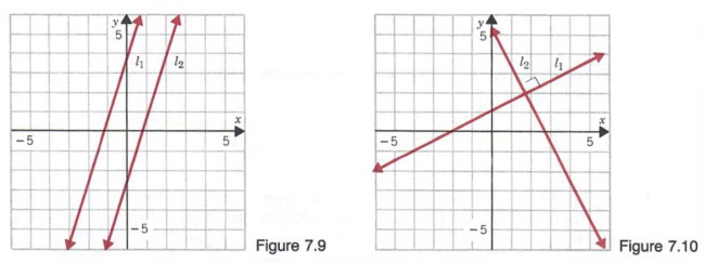 These lines will never intersect and are called parallel lines. Now consider the lines shown in Figure 7.10. Line l1, has slope m1 = 1/2 and line l2 has slope m2 = -2. In this case,
