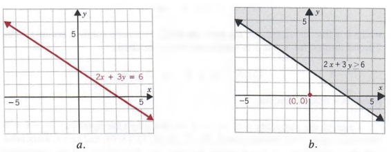 We first graph the line 2x + 3y = 6 (see graph a). Using the origin as a test point, we determine whether (0, 0) is a solution of 2x + 3y ≥ 6. Since the statement