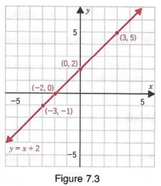 If we graph the points determined by these ordered pairs and pass a straight line through them, we obtain the graph of all solutions of y = x + 2, as shown in Figure 7.3. That is, every solution of y = x + 2 lies on the line, and every point on the line is a solution of y = x + 2.