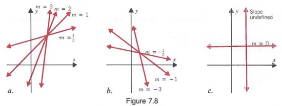 Lines with various slopes are shown in Figure 7.8 below. Slopes of the lines that go up to the right are positive (Figure 7.8a) and the slopes of lines that go down to the right are negative (Figure 7.8b). And note (Figure 7.8c) that because all points on a horizontal line have the same y value, y2 - y1 equals zero for any two points and the slope of the line is simply