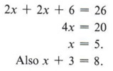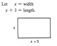| The perimeter is the distance around the figure. Thus, two sides of the rectangle measure x and the other two sides measure x + 3. Again, the check is very important. |