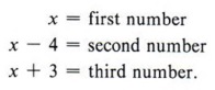 | Again, we could just as well let x represent the second or third number. The important thing to remember is to label each algebraic expression with the number that it represents. |
