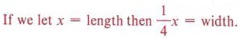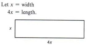 | This particular way of stating the unknowns avoids fractions. What does x represent? Try this problem again using x = length, x/4 = width. Which way is easier? |