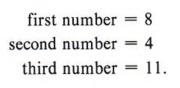 We check the problem by noting that the first number (8) is four more than the second (4) and is three less than the third (11) and that their sum is 23.