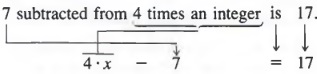 "If seven is subtracted from 4 times an integer, the result is 17,"