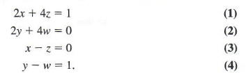 Since equations (1) and (3) involve only x and z, while equations (2) and (4) involve only y and w, these four equations lead to two systems of equations,