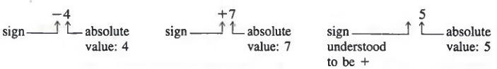 The absolute value of a signed number is the value of the number without regard to its sign. We can think of a signed number as having two parts: the sign of the number and the absolute value of the number. When no sign is written, we assume that the sign is positive. For example,