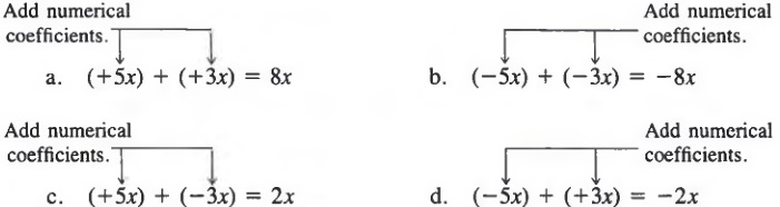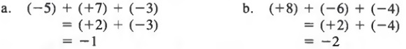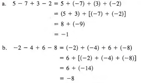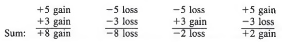 To see what is meant by the sum of two signed numbers, we can think of such numbers as representing gains and losses, (+) numbers denoting gains and (-) numbers denoting losses.
