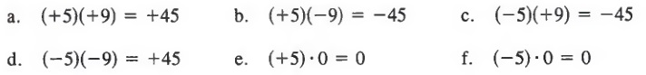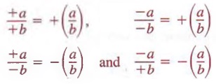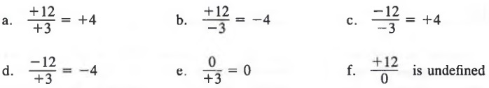 We define the quotient of two integers the same way we define the quotient of two natural numbers (Section 1.3). However, the sign of the quotient has to be consistent with the rule of signs for the multiplication of signed numbers. Recall that for natural numbers, the quotient a/b is the number q such that b · q = a. Let us examine the quotient of two signed numbers by considering some numerical cases.